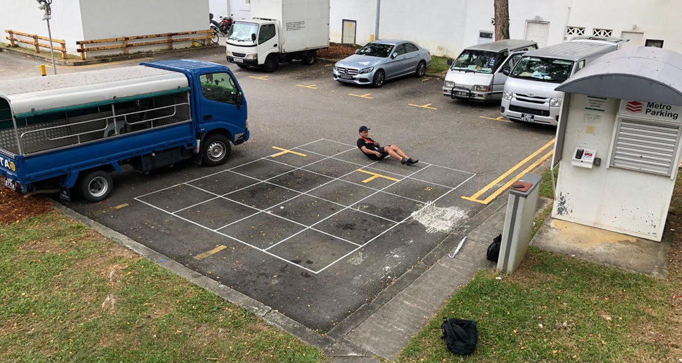 In order to properly develop design sensitivities and feel how its like for the user, I went down to Amoy Street on a quiet Saturday morning and started taping out the 4m x 5m grid. This is illegal, but I did it anyway. I sat down in the space, pretended to shower in the space, laid down and see what its like to sleep within a 2m x 1m grid -- all this to ensure I am not out of touch with who I am designing for.